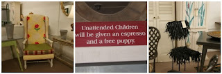 A friend and I spent the afternoon browsing an artsy section of a neighboring town and found these interesting chairs. I've never seen a wingback with this upholstery but nontheless, it was cute. And the little black number on the right - quirky and adorable! And the sign - well, we've all been there!!